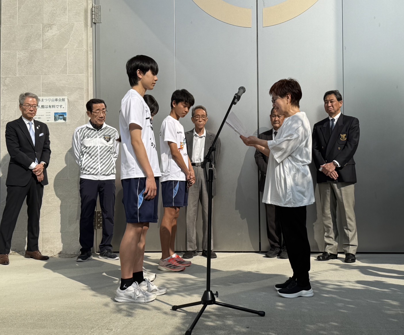 羽島市長、同教育長、竹鼻中学校長、同前校長、なごみスポーツクラブ理事長、同校男子バスケットボール部、女子バスケットボール部、陸上競技部の代表部員40名など関係者が出席して行われました。