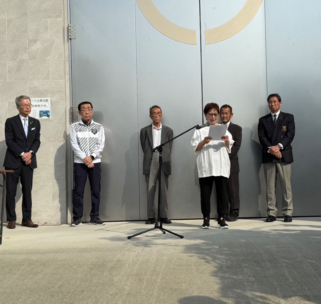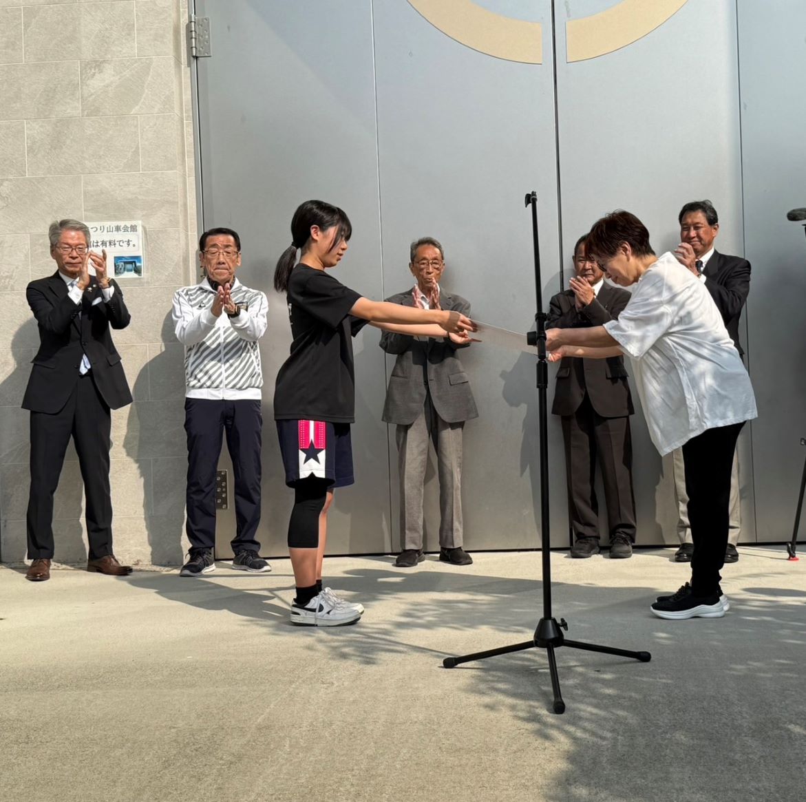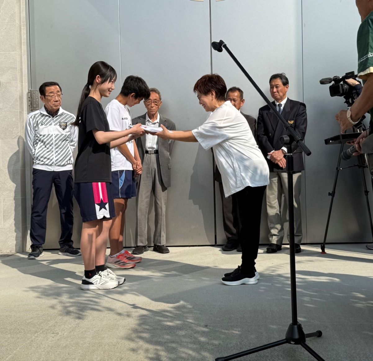 寄付贈呈式は、ラジオ体操に参加した250人近い住民の前で行われ、中学生のクラブ活動部員に大きな拍手を持って激励しました。